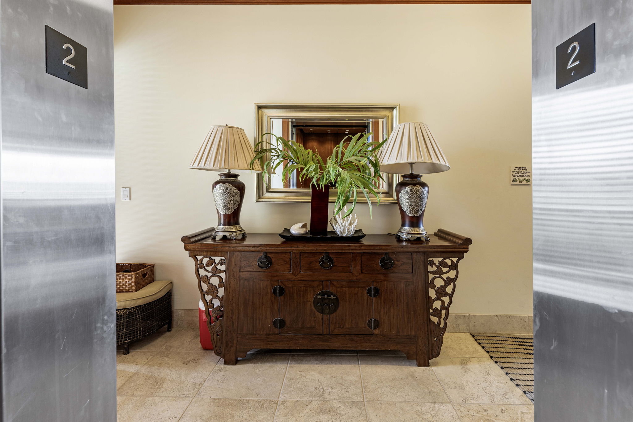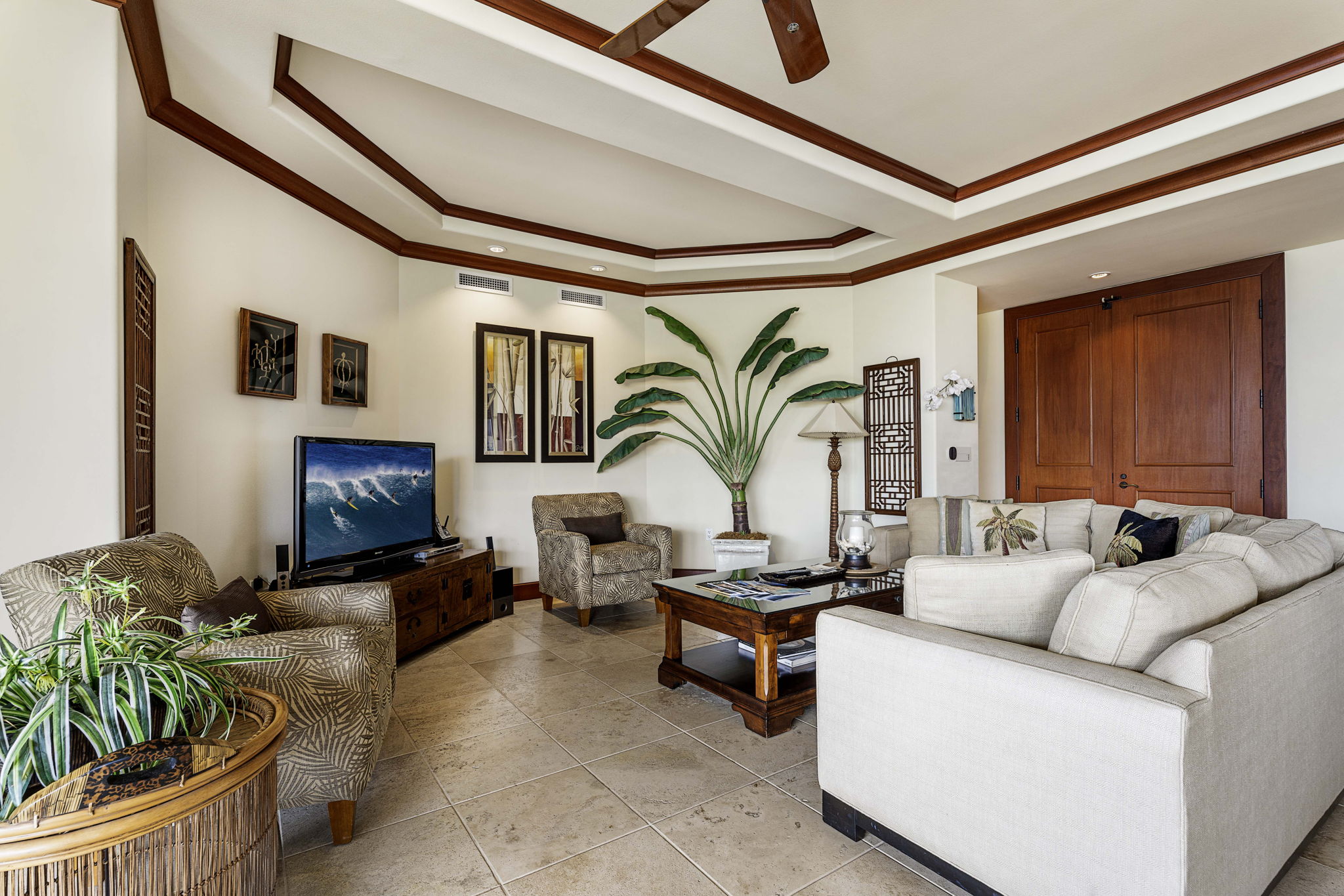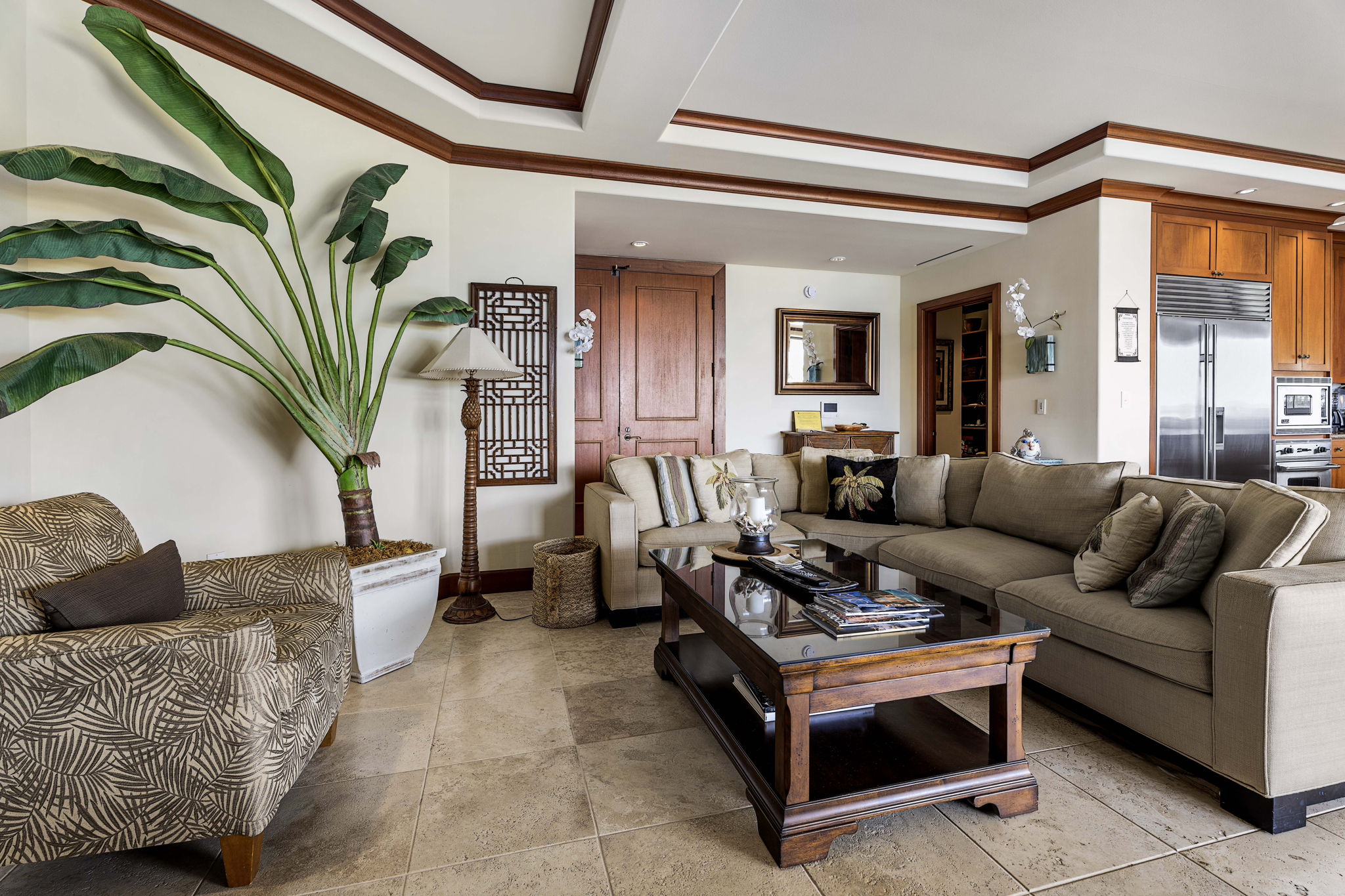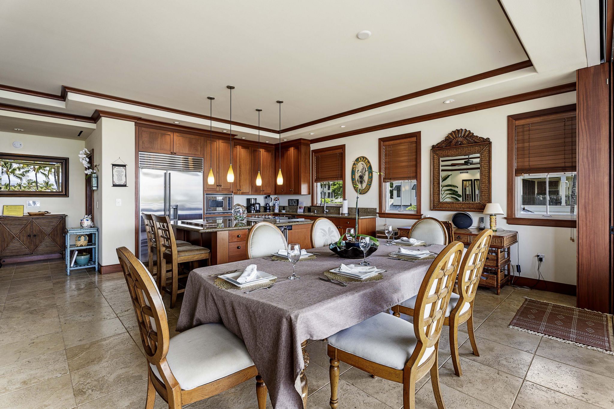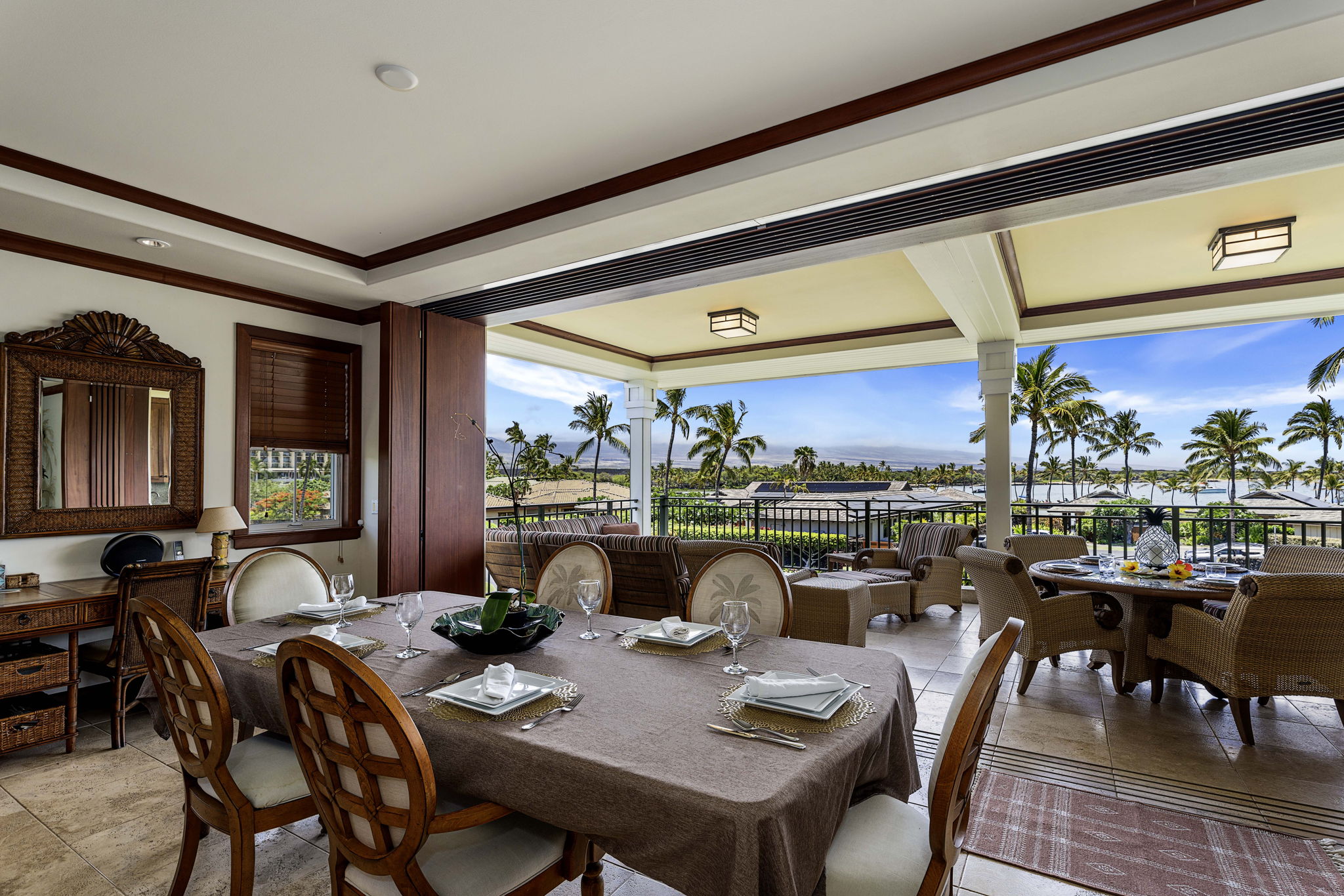 Step through the entry and immediately feel the elegance of African mahogany trim, solid mahogany doors, and travertine flooring throughout. The expansive great room opens effortlessly through 20-foot mahogany pocket doors, creating a seamless flow between indoor and outdoor living. On the spacious lanai, entertain or unwind with a built-in Viking grill and wet bar, the perfect setting for enjoying ocean breezes and the soft sounds of the waves nearby.