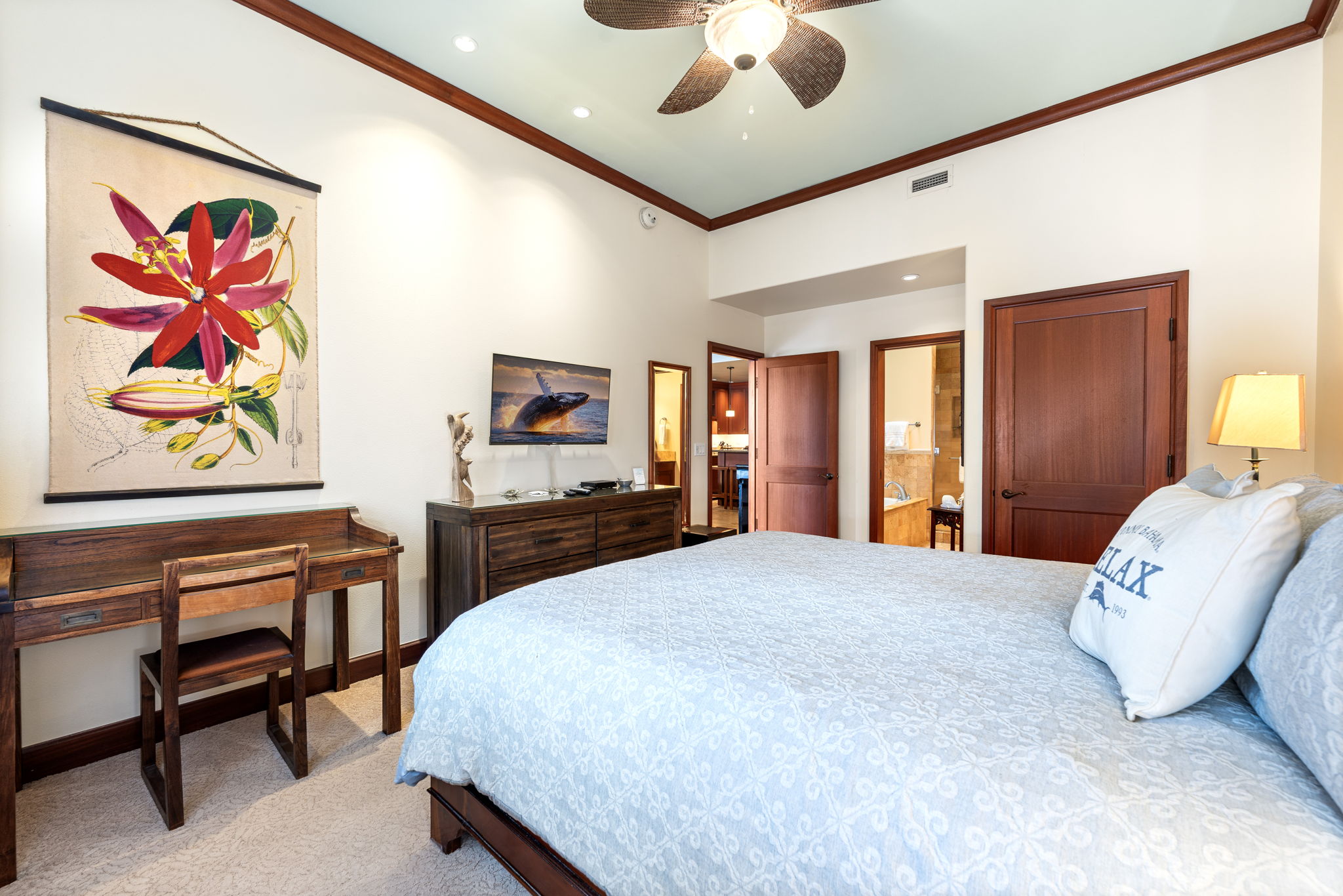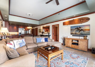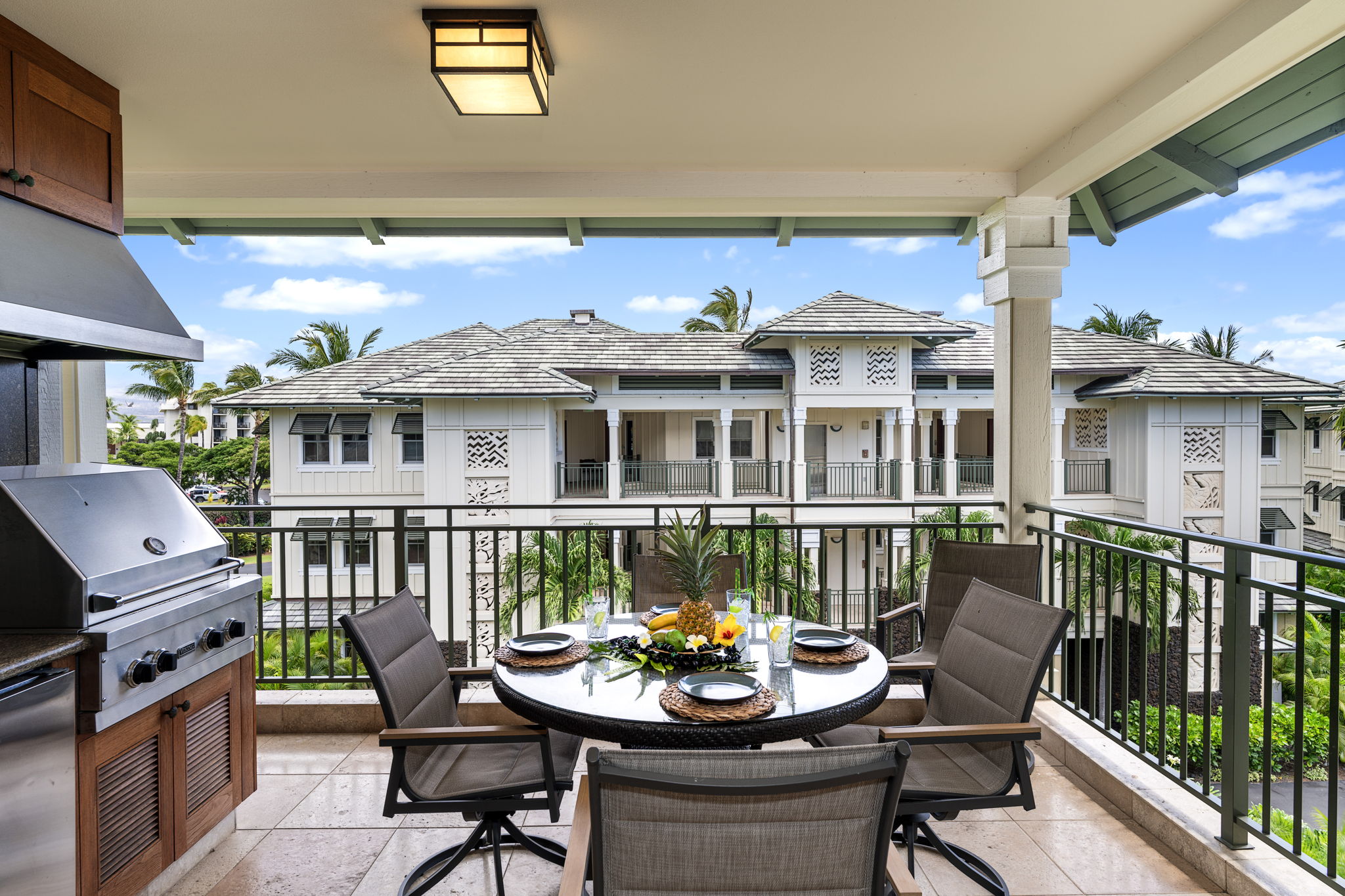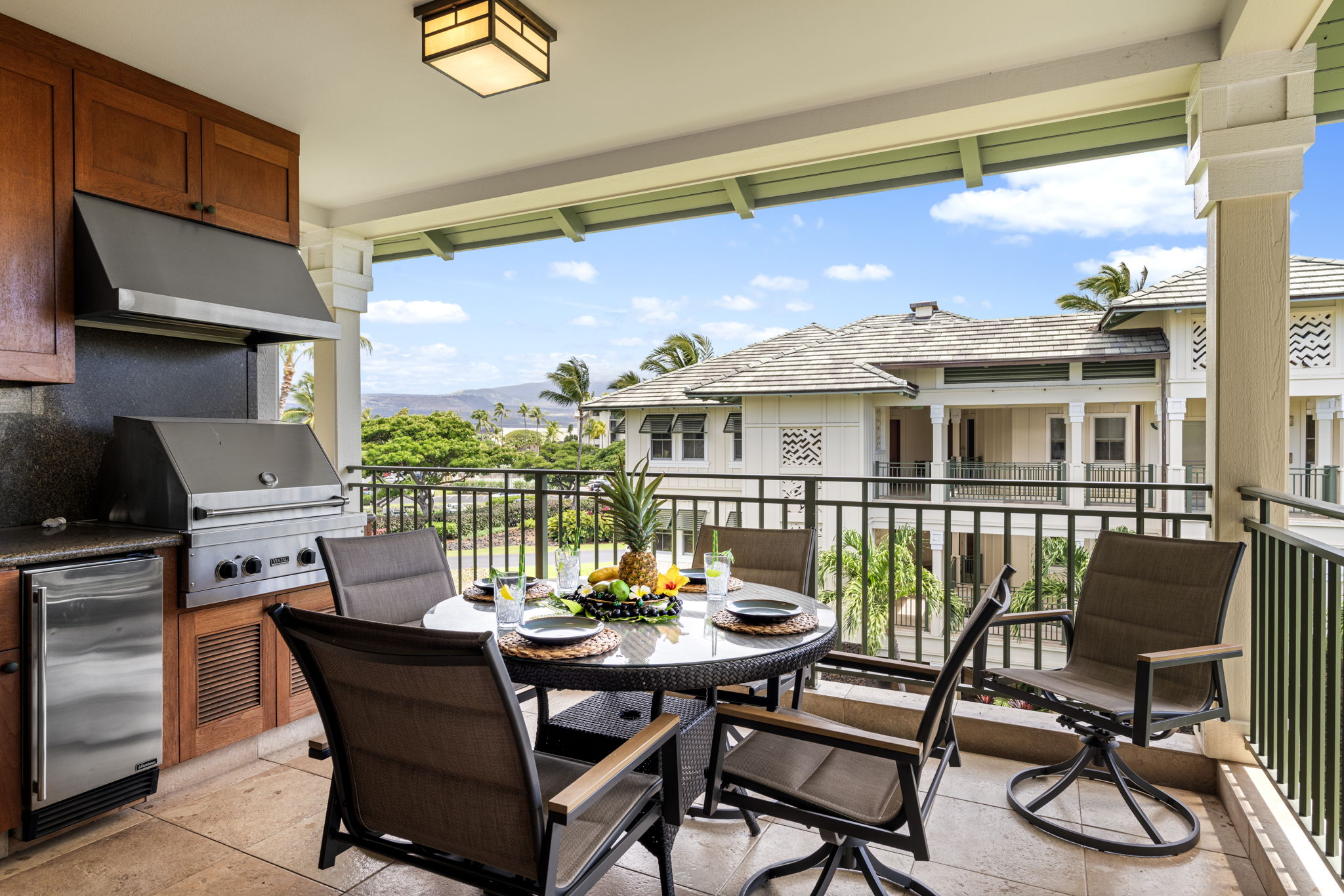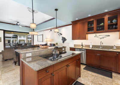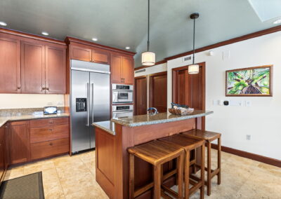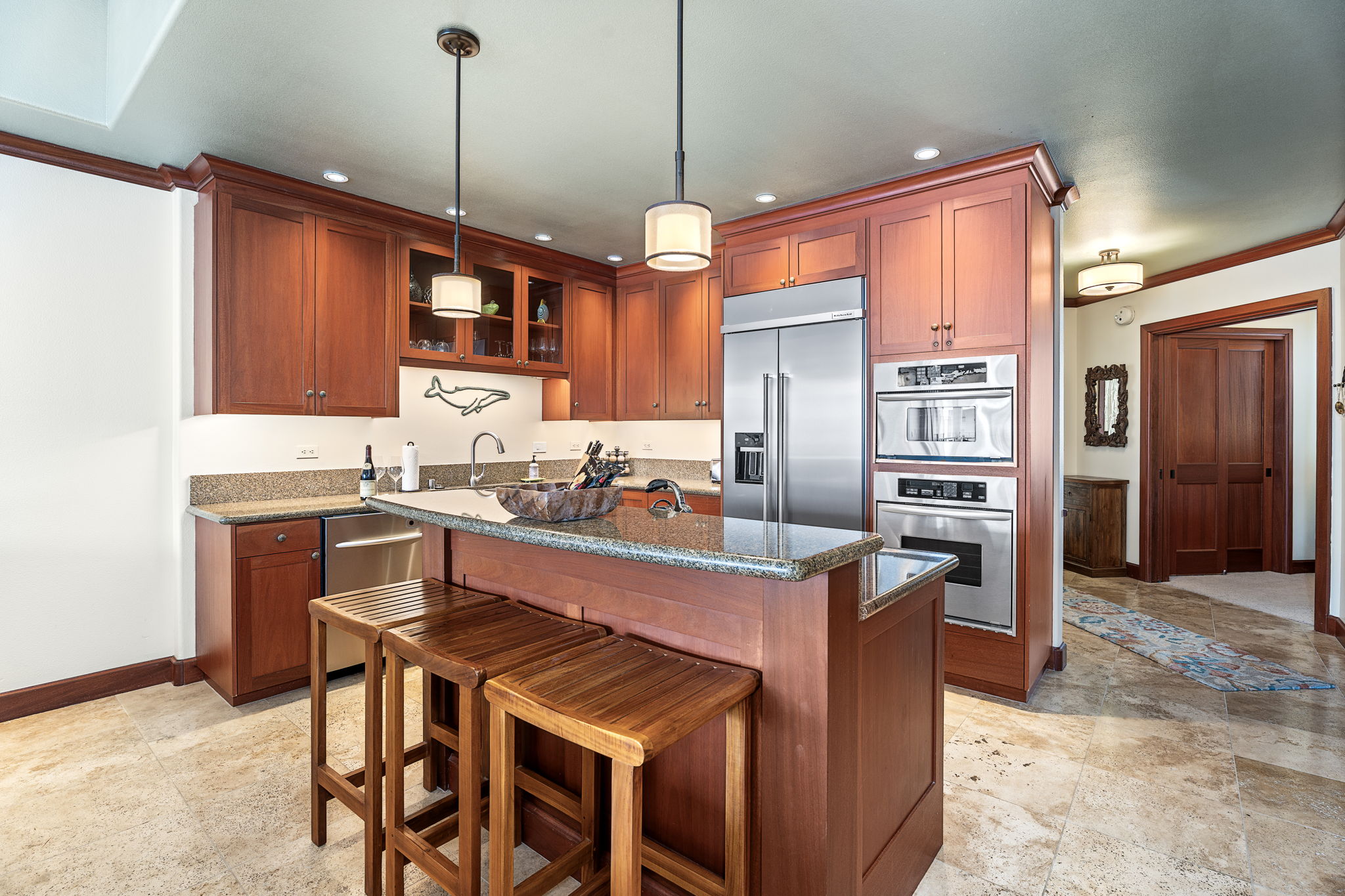 Experience resort living at its finest in this beautifully appointed 2-bedroom, 2-bathroom penthouse condo at Kolea, Waikoloa Beach Resort’s only beachfront community. This top-floor residence offers 1,270 square feet of refined indoor living, enhanced by 12-foot pocket doors that open to a spacious lanai featuring a Viking grill and wet bar—perfect for outdoor dining and entertaining in the island breeze. Rich African mahogany trim and solid doors add warmth and sophistication throughout, while high ceilings and natural light create an inviting, open atmosphere. The well-designed floor plan offers privacy between bedrooms and effortless flow through the main living areas. Ideally located just steps from the white sands of ‘Anaeho‘omalu Bay, this penthouse provides access to all the premier amenities of Waikoloa Beach Resort, including world-class dining, shopping, golf, and ocean activities.